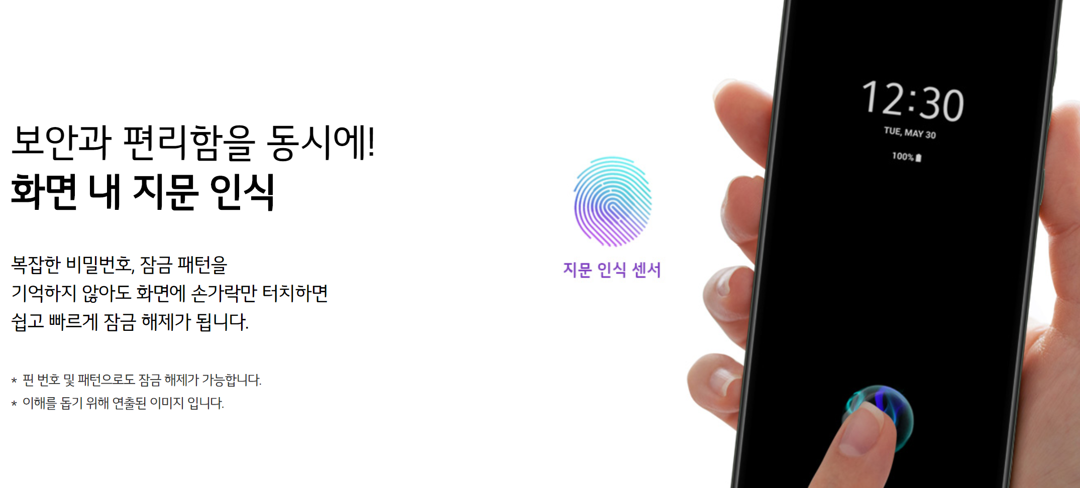 LG 윙도 화면 지문인식이 탑재되어 있습니다. 최근에 저면 화면 비율을 늘리기 위해 물리 버튼을 최소화하면서 화면 내 지문인식이 대중화되고 있습니다. 다만, LG 윙은 초음파식이 아닌 광학식 지문인식으로 물 등 이물질이 있을 경우 인식률이 낮을 것으로 생각됩니다.