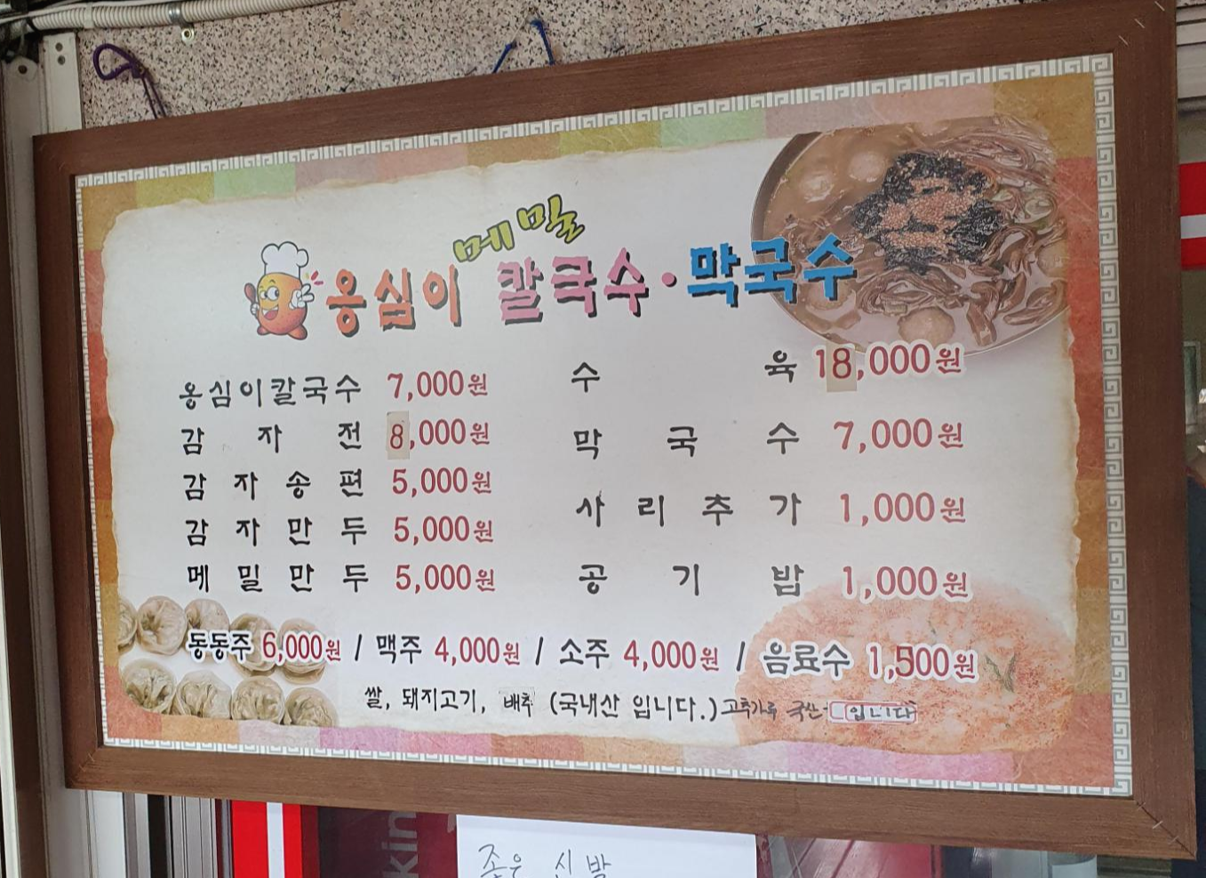 메뉴는 옹심이 맛집이라 옹심이 칼국수가 메인이구요. 그 외에 감자로 된 요리와 수육을 판매하고 있습니다. 대부분 분들은 방문하시면 1인 당 옹심이칼국수를 주문하고 추가로 감자전이나 수육을 주문해서 먹습니다.