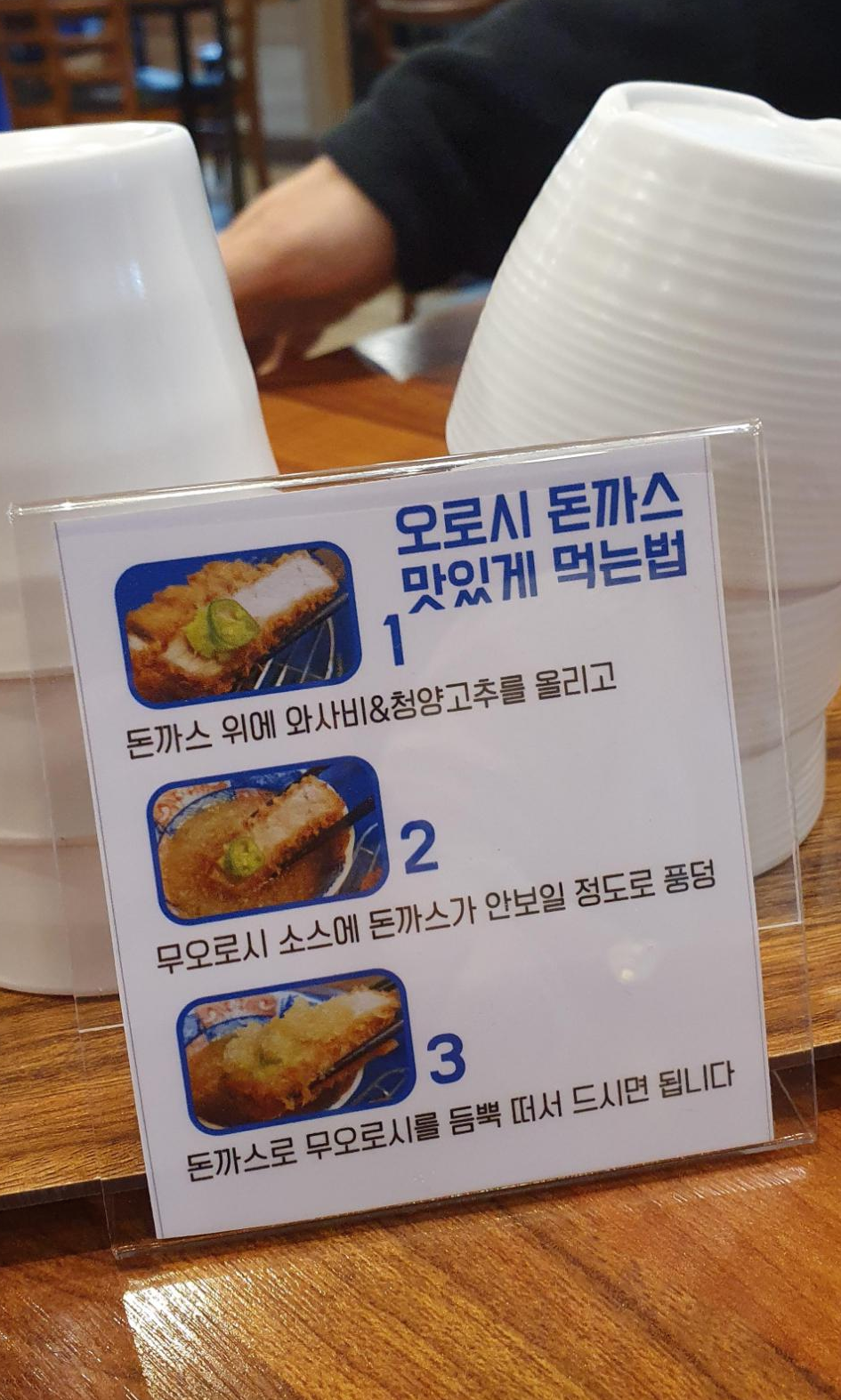 그리고 마곡 맛집 테이블식스의 오로시 돈까스를 맛있게 먹는 법이 있는데요. 사진처럼 돈까스 위에 청양고추와 와사비를 기호에 맞게 올리고 오로시 돈까스 용 소스를 충분히 찍어 먹으면 가장 맛있게 먹을 수 있는 방법인데요. 이렇게 먹어보니 사람들이 오로시 돈까스를 먹는 이유를 알겠더라고요. 수명산 돈까스 맛집 테이블식스에 처음 방문한다면 오로시 돈까스를 꼭 먹어봐야 될 정도였습니다.