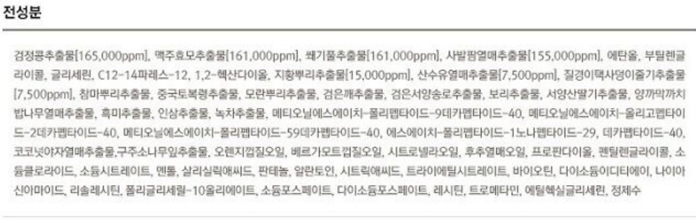다음으로는 토닉의 성분입니다. 토닉 성분을 보면 천연성분이 많고 샴푸에 있던 탈모 효능 성분이 들어 있는데요. 모발에 좋은 검정콩추출물, 맥주효모추출물, 쐐기풀추출물 등 천연성분이 들어 있습니다. 그리고 위에서 말한 판테놀, 살릭실릭애씨드, 나이아신아마이드도 같이 들어 있습니다.
