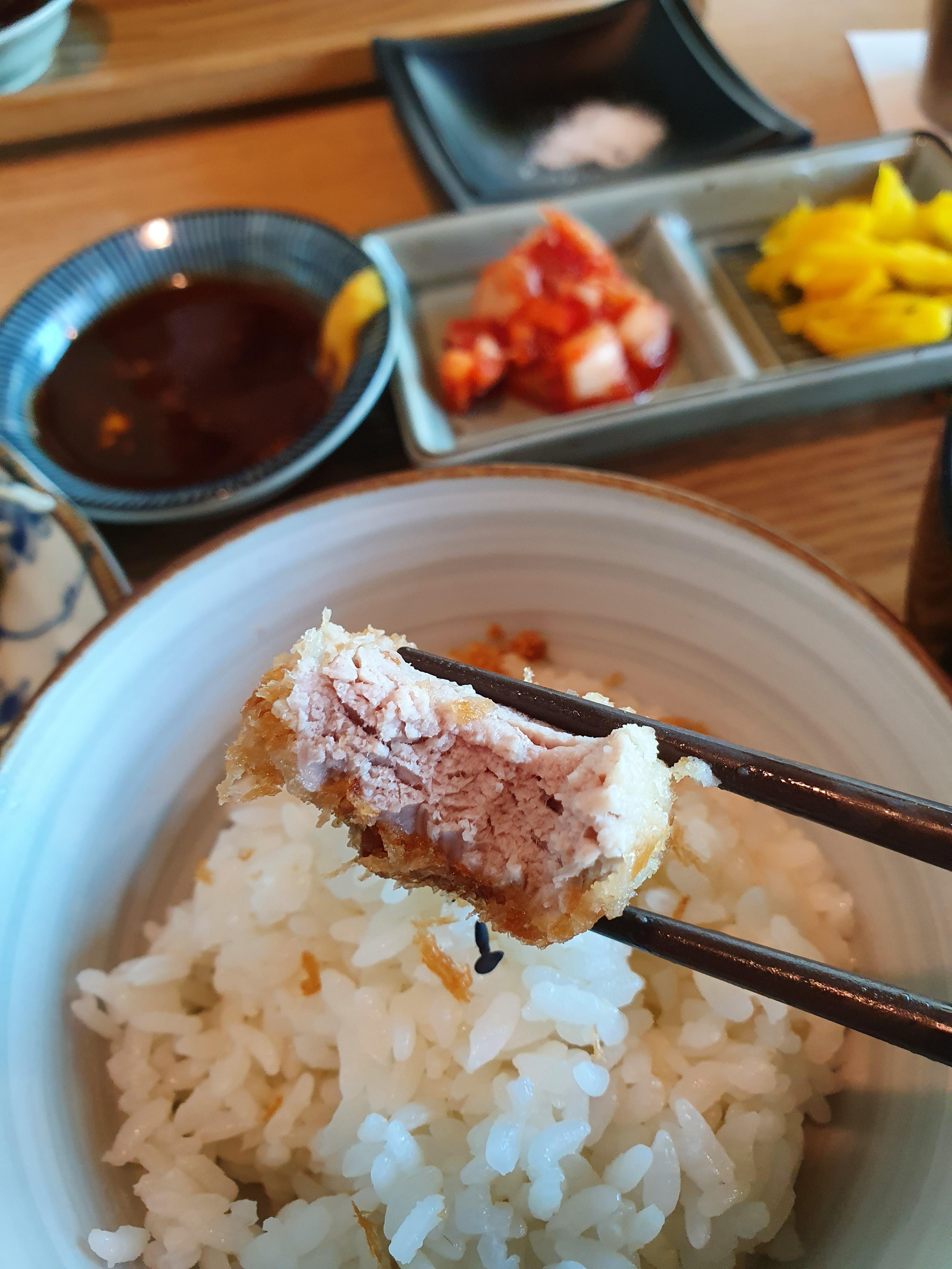 먼저 상 등심 돈가스인데요. 두 덩이가 나와서 넉넉하게 먹을 수 있습니다. 처음에 큰 기대를 안 하고 갔는데요. 처음 먹고 감탄했습니다. 일본에서 돈가스 맛집을 갔을 때 느낄 수 있는 부드러움을 느낄 수 있었는데요. 소고기 돈가스인 규카츠에서 느낄 수 있는 고기의 부드러움을 수돈가스 상 등심 돈가스에서 느낄 수 있었습니다.