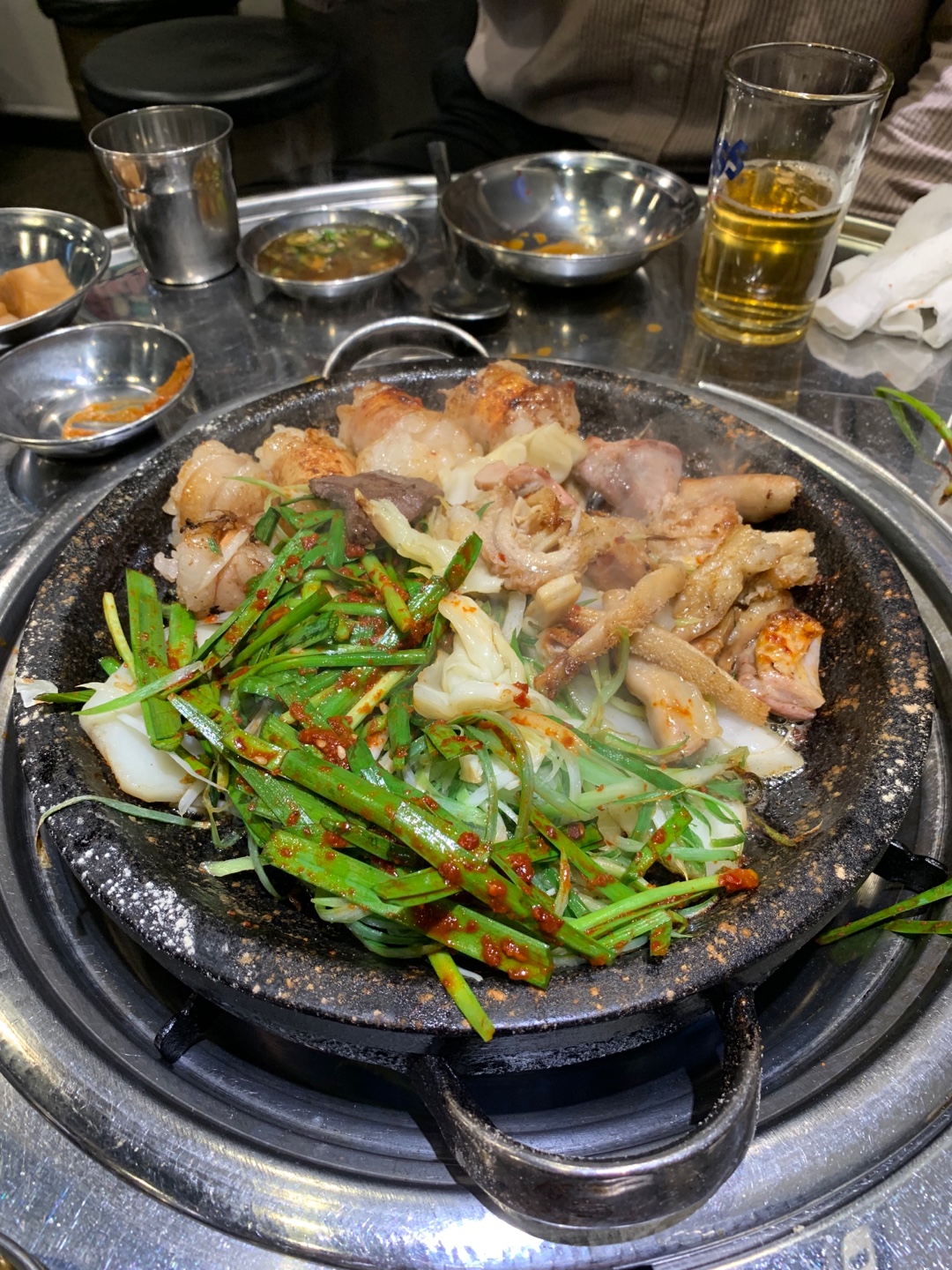 음식을 주문하면 곱창찌개를 제공해 주는데요. 술 당기게 만드는 메뉴 였습니다. 곱창이 많이 들어 있진 않았지만 가끔 씹히는 곱창 건더기나 찌개 맛을 더 맛있게 해줬습니다.