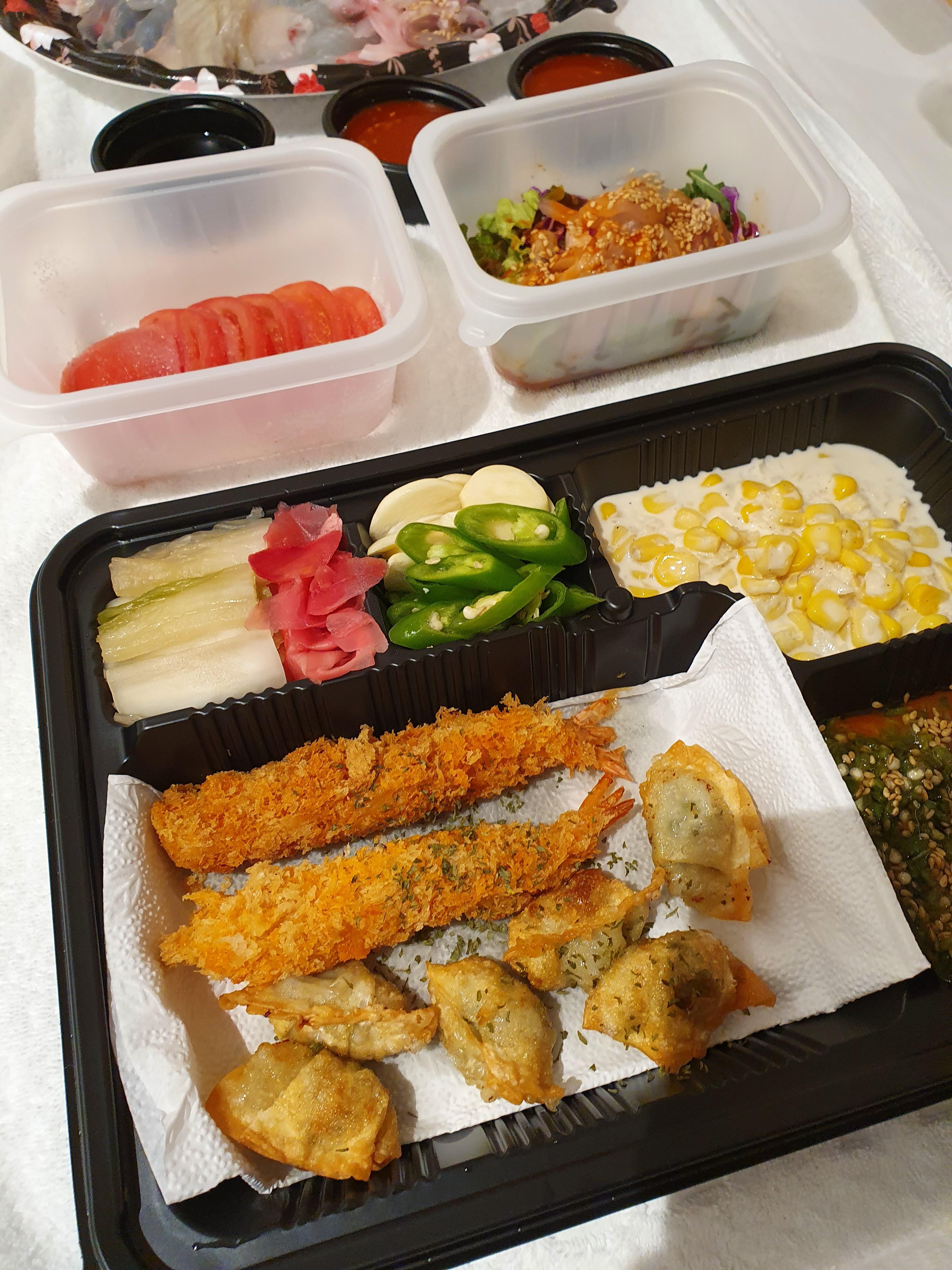 가게에서도 먹을 수 있는데요. 저는 포장해서 숙소에서 먹었습니다. 배달도 가능해서 숙소에서 주문해서 먹는 분들도 많다고 하네요. 모둠 회를 주문하면 사진처럼 제철 회 세 종과 사이드로 설탕에 절인 토마토와 각종튀김을 주는데요. 양도 많고 가격도 착해서 많이들 찾는 맛집인 것 같네요.