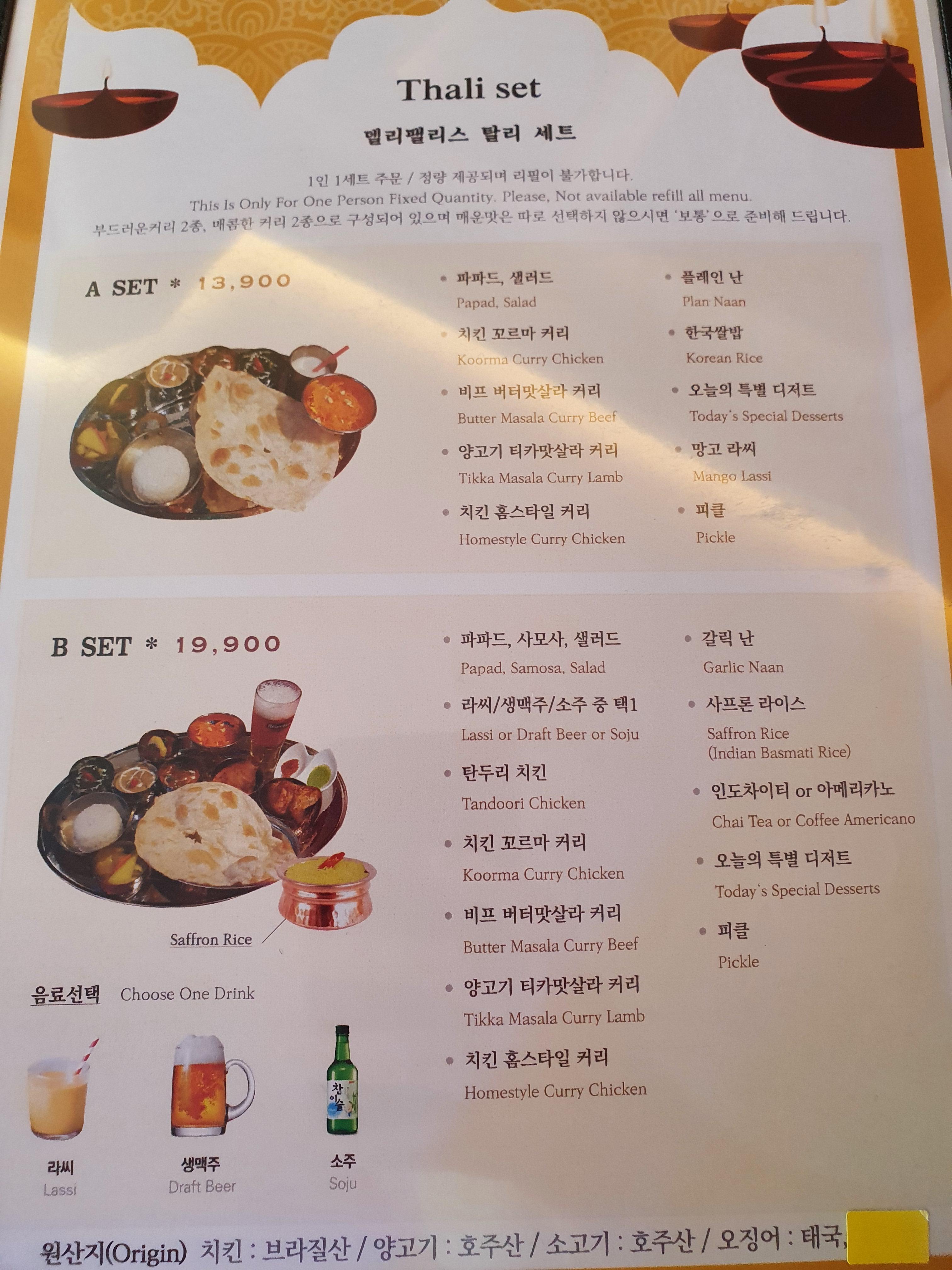 A세트와 B세트 차이점은 음료를 술로 선택할 수 있다는 점과 탄두리 치킨 제공, 난과 밥을 좀 더 비싼 메뉴로 바꿔준다는 차이점이 있습니다.