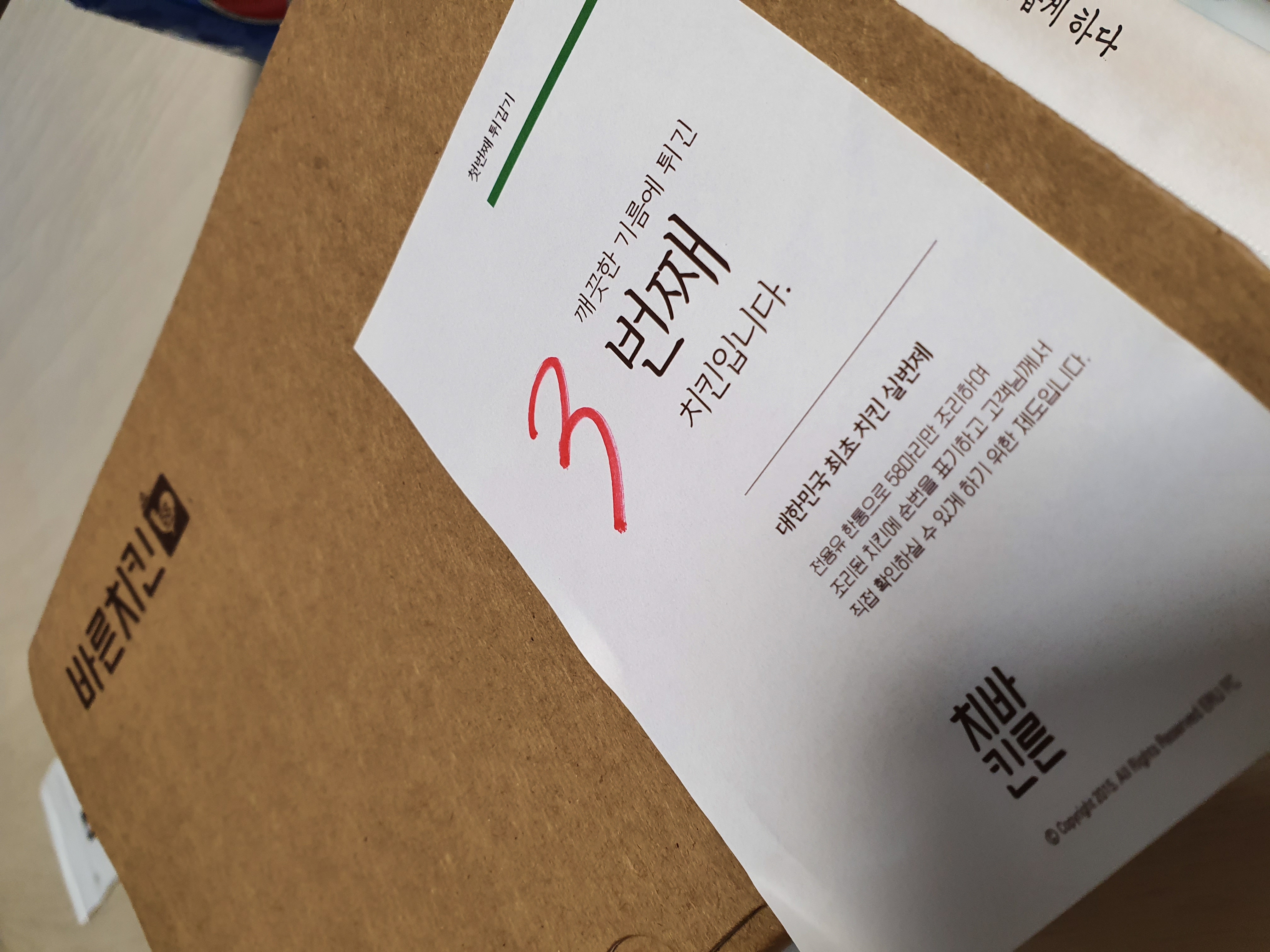 박스 위에 내가 받은 치킨이 몇번째 튀겨진 치킨 인지까지 표시해 줘서 믿음이 가는거 같습니다.