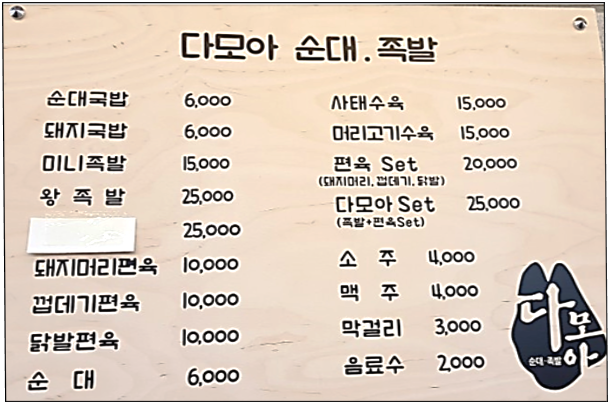 다모아순대족발은 순대보단 족발이 유명합니다. 위에 메뉴는 매장에서 먹는 가게의 메뉴판이고 아래 가격은 포장 시 족발 가격입니다. 메뉴판만 보셔도 아시겠지만 매장 식사는 순대를 중심으로 하는 것을 알 수 있습니다. 포장은 족발 중심입니다.