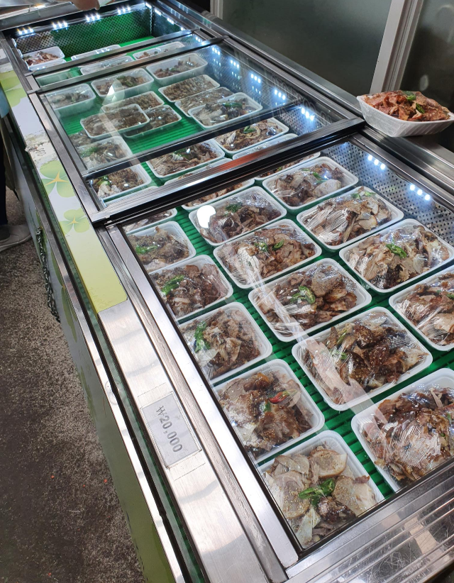 족발이 대, 중, 소 별로 포장이 되어 있는데요. 매장 앞에 냉장고에 들어있습니다. 여기서 원하는 족발을 골라서 계산하면 됩니다. 같은 사이즈라도 고기양이 조금씩 다르기 때문에 신중하게 골랐습니다. 저는 이미 다른 음식을 먹은 상태라 집에서 간단하게 먹기 위해 가장 작은 사이즈로 포장 구매했습니다.