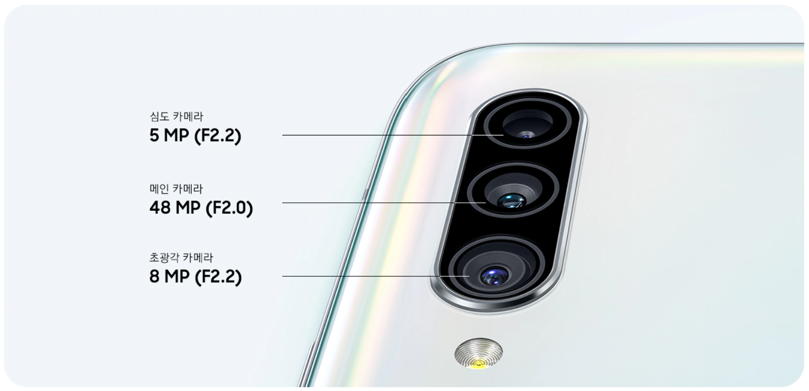 갤럭시 A90은 후면에 3개의 카메라가 탑재되어 있습니다. 최근에 출시된 스마트폰에 비해 적은 수의 카메라 지만 19년도에 출시된 스마트폰에 비해서는 프리미엄급 휴대폰 수준의 카메라 개수를 탑재하고 있습니다.