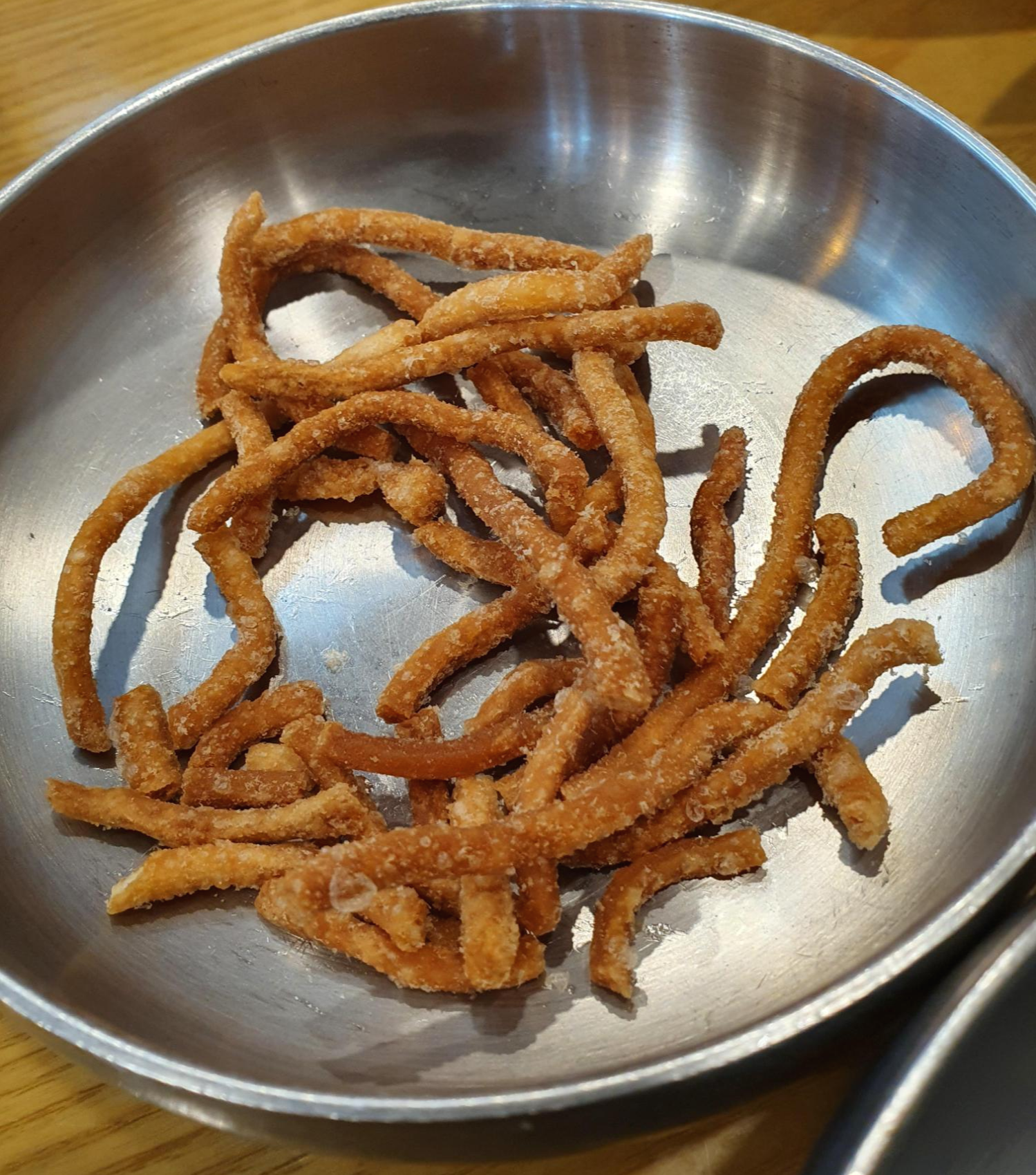 저는 청국장정식을 주문했는데요. 자리에 앉아 주문하면 사진처럼 기본 밑반찬을 가져다줍니다. 그중에 식전 과자도 있는데요. 달지 않은 맛에 허기 채우고 입맛 돋우기 좋았습니다. 이 과자를 먹으면서 기다리니 메인 음식인 청국장과 보리밥이 나왔습니다.