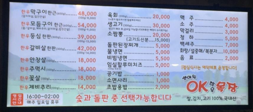 가격대는 엄청 싸진 않지만 집에서 사 먹는 한우 가격대 입니다. 한우가 보통 밖에서 먹으면 사먹는 가격보다 훨씬 비싼데요. 대구 맛집 반야월OK한우목장은 마트에서 판매하는 가격대에 한우를 맛볼 수 있어 다른 가게 대비 상대적으로 저렴하게 한우를 먹을 수 있습니다.