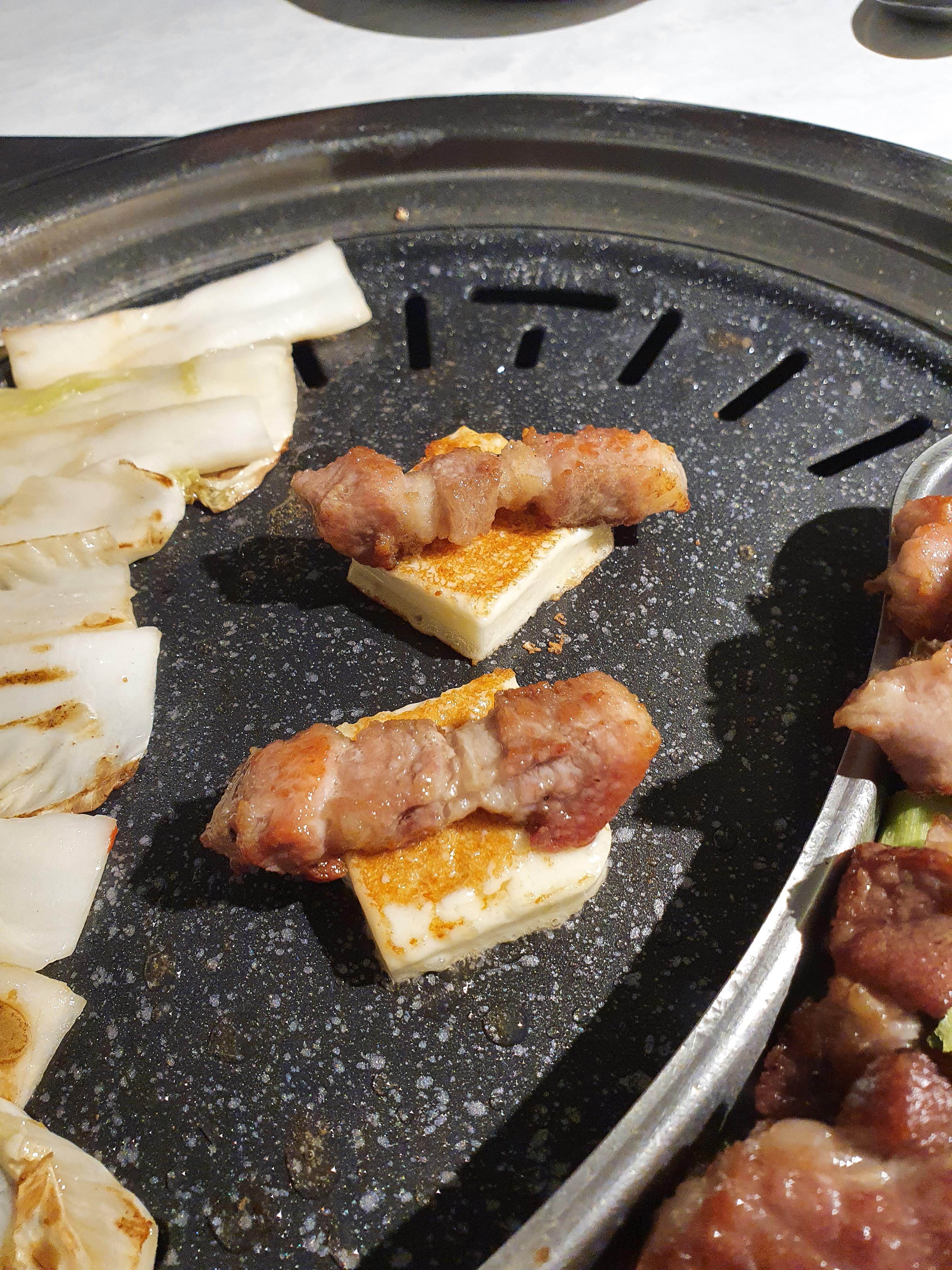 돼지고기를 맛있게 먹는 방법은 다양한데요. 곳간504에서는 명이나물과 각종 소스를 제공해주기 때문에 입맛에 맞게 먹을 수 있었습니다. 하지만, 곳간504에서는 꼭 먹어봐야 할 조합이 있는데요. 바로 구워 먹는 치즈와 삼겹살의 조화입니다. 위의 사진처럼 구워 먹는 치즈를 살짝 구워서 거기에 삼겹살을 올려서 먹으면 정말 평소에 먹어보지 못한 조화를 느낄 수 있었습니다. 구워먹는 치즈와 삼겹살은 모든 분들이 맛있다는 것을 알텐데요. 그 맛있는 두가지를 동시에 먹으니 더욱더 맛있더라고요. 거제 맛집 곳간504에 방문한다면 구워먹는 치즈랑 삼겹살 조합을 꼭 주문해보시길 강추드립니다.