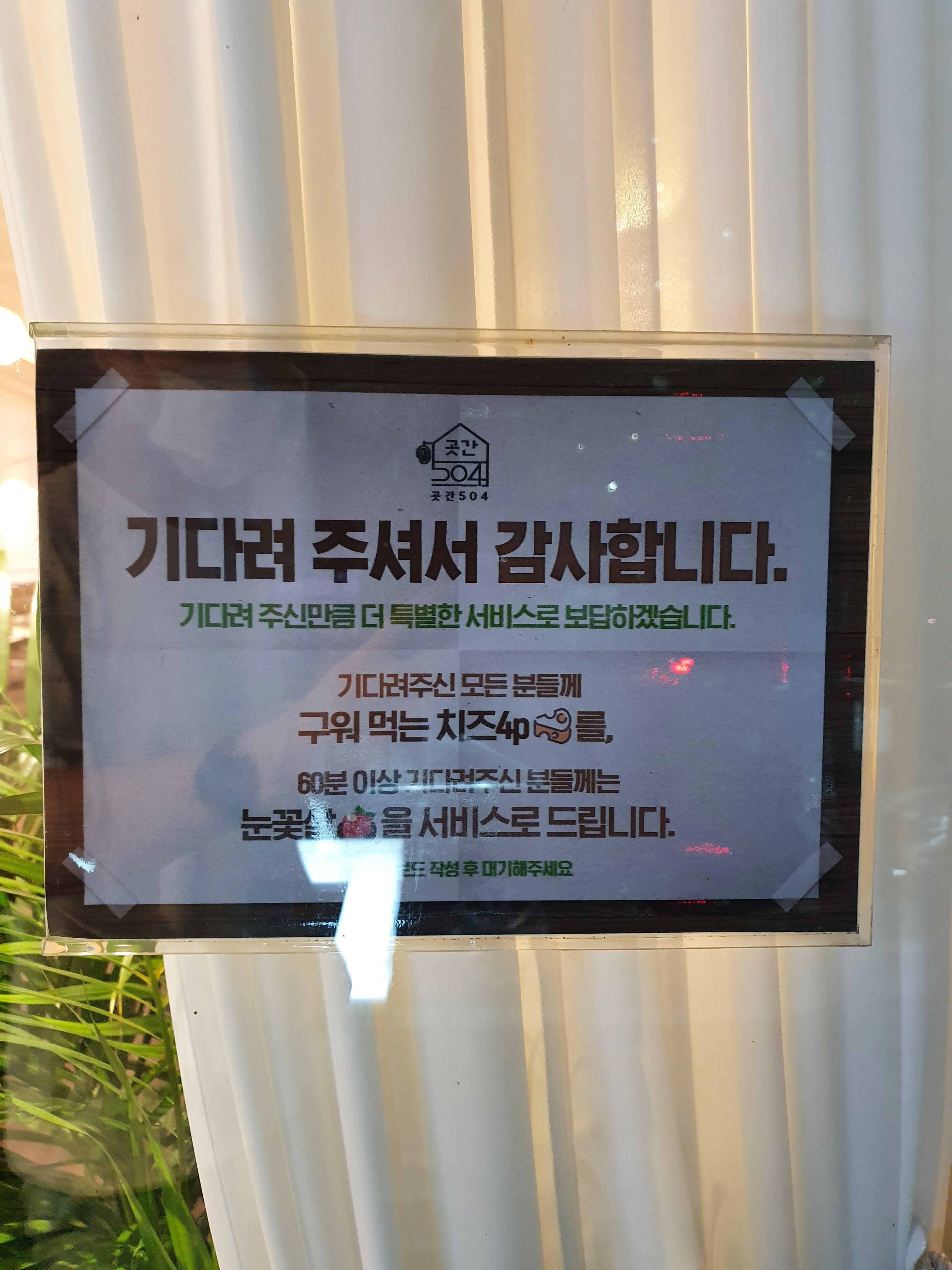 거제도 맛집 곳간504는 웨이팅이 있는 맛집인데요. 다른 맛집과 다르게 웨이팅 시에 서비스를 제공해줘서 기다리는 손님들도 즐겁게 기다릴 수 있게 해 둔 것 같습니다. 저 같은 경우도 방문했을 때 웨이팅이 있어서 구워 먹는 치즈를 서비스로 받았는데요. 60분 이상 기다리는 분들에게는 눈꽃살을 제공해준다고 하네요. 그리고 마냥 가게 앞에서 기다리는 가게가 아니고 휴대폰 번호를 적어놓고 가면 미리 연락을 줘서 하염없이 가게 앞에서 기다리라고 하는 가게 들과 차별점이 있어 기다리는 것도 큰 문제없었습니다.