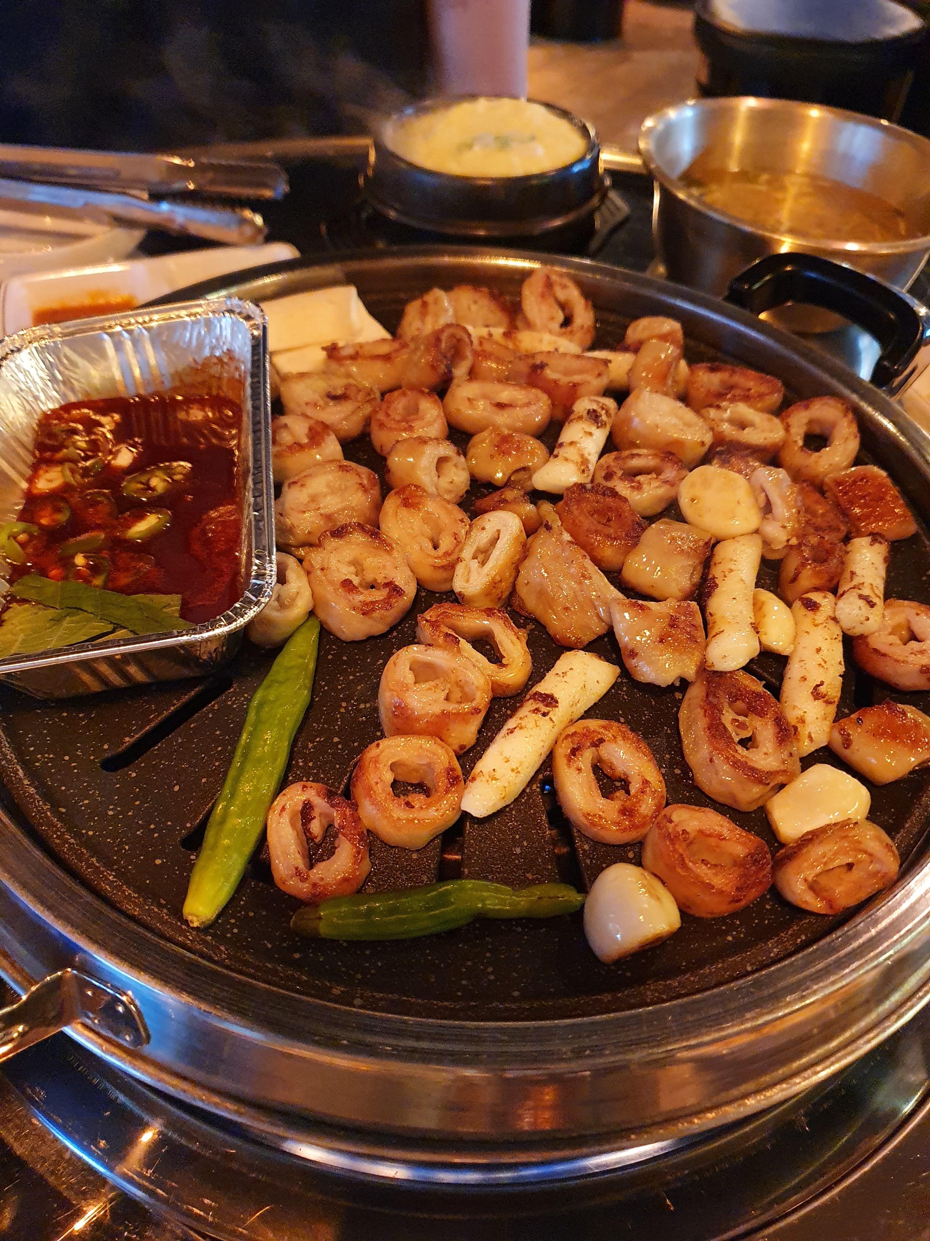 먼저, 막창을 주문했는데요. 막창 소스도 같이 나오는데 매콤한 편이라서 매운 걸 싫어하시는 분들은 조금만 찍어 먹는 걸 추천드립니다. 기본적으로 초벌을 해오기 때문에 잠깐만 구워서 바로 먹을 수 있어 좋았습니다. 고기를 잘 굽는 분은 모르겠는데 잘 못 굽는 사람들은 막창 같은 건 얼마나 익혀야 될지 몰라 태우는 경우도 있는데요. 초벌이 되어 있고 몇 분 후에 먹으라는 가이드를 줘서 맛있게 먹을 수 있었습니다. 막창도 고무줄처럼 질긴 막창이 있는데요. 신촌 맛집 정통막창은 적당한 질김에 고소한 맛이 나서 정말 다시 찾고 싶은 막창 맛이었습니다.